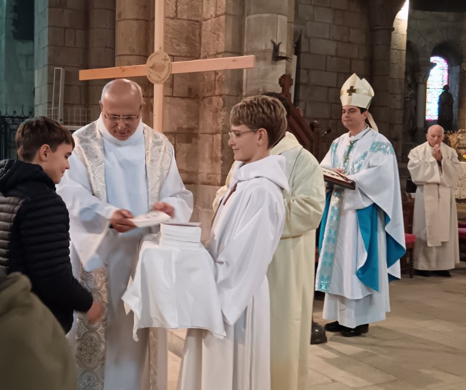 Lors de cette messe de l’Avent, une quinzaine d’écoliers, collégiens et lycéens ont vécu leur entrée en catéchuménat. Devant cette assemble de jeunes, ils ont répondu à l’évêque et ont partagé leur découverte de Jésus Christ qui est Lumière pour eux. Ils veulent continuer à apprendre à la connaitre et le suivre. Avec la signation par Mgr Drouot, le Père Joël Urion et le Père Jean Bosco Akogo ont remis une croix à chaque jeune. Après l’évangile et l’homélie de Mgr Drouot, chaque catéchumène a reçu l’évangile, Parole de Dieu qui les accompagnera sur leur chemin.