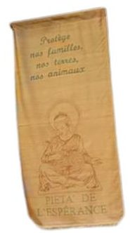 L’angoisse du « comment survivre » est immense. Anne-Alexandra est la sculptrice de la Pietà de l’Espérance, une œuvre dédiée au monde agricole, exposée dans l’église de Rouy, où chacun peut venir se recueillir. Elle est venue avec deux bannières représentant cette œuvre, porteuses d’un message de prière :